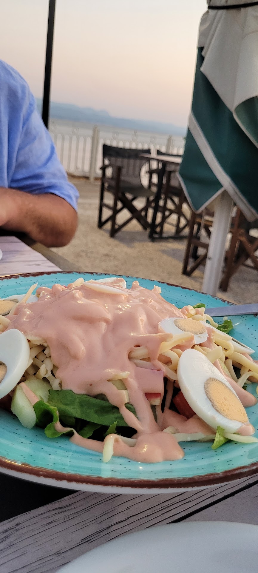 Pour changer de la cuisine traditionnelle grecque, nous nous sommes arrêtés ici pour manger une pizza. Vous pouvez également trouver des salades, des pâtes et quelques gourmandises. Le service est parfait et rapide. Nous avons pris une salade du chef et une pizza spéciale. Avec un verre de vin, nous avons payé 25€ pour 2. Ambiance en bord de mer très...