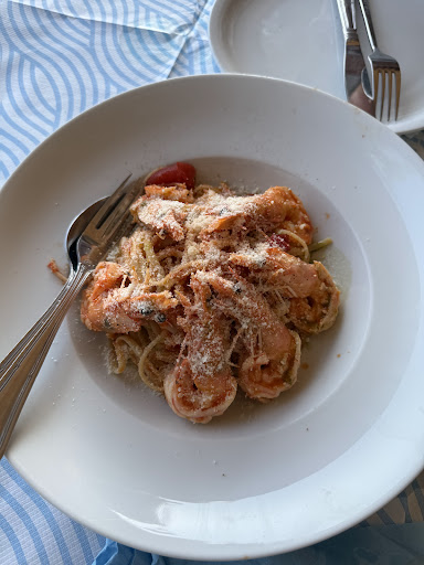 I ordered the shrimp spaghetti, fried cod, and fried calamari. The spaghetti was simple, tasty, and generous in portion, with fresh shrimp. The fried cod, however, was disappointing, while the fish was fresh, the batter lacked flavor, and the fillet contained many bones. This is dangerous for something advertised as bone-free, and we only caught it after the first few bites. The fried calamari stole the show, extremely fresh and delicious. It came without sauce, just lemon, so we asked for whatever they had and got sweet chili sauce, which was okay. The setting is fantastic with a lovely seaside view. Service was fine, though a bit odd that paying by card required walking inside to the register. We were served a complimentary dessert at the end, which was outstanding. Overall, mixed feelings on this one, beautiful location and great calamari, but the cod experience...