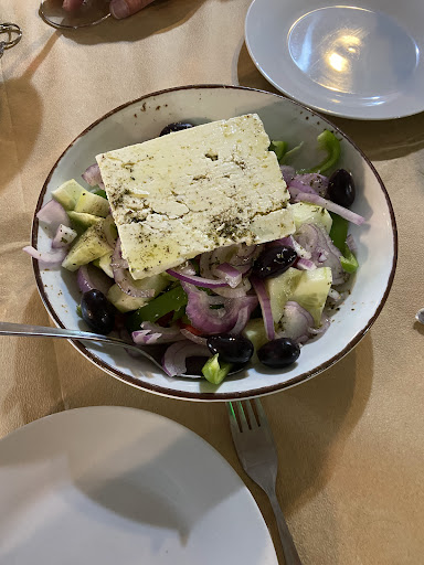 Commençons par les point négatifs: Les légumes (concombre et tomates) pour la salade grecques étaient horribles. Ils étaient extrêmement dur , dommage pour une salade qui devrait être parfaite en Grèce. Heuresement la fêta était bonne, mais les légumes gâchaient tout le plat. Le vin était servi glacé, ce qui laisse à penser qu’il n’était pas de bonne qualité. Nous n’avons pas aimé les frites non plus. La pastèque servis à la fin du repas n’était pas bonne non plus. (farineuse et sans goût).
