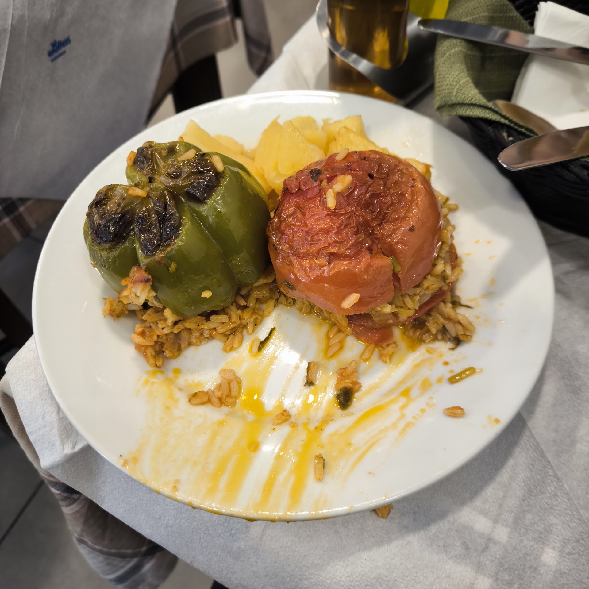 Read moreThey are friendly, they speak English. They have English menu. Portions are enormously big, so don't order more than one dish per person. Prices are very comfortable. They served us sweets in the end without charge. I recommend you guys to try meat pie, it's full of meat. If you are vegetarian, go for gemista, it's pepper and tomato filled with tasty rice. Only thing that made me upset here, is that they included two breads in the menu although we didn't touch bread. It was just 2 euro extra, and service was good, so we didn't make a problem out of it. But if you are conscious about it, pay...