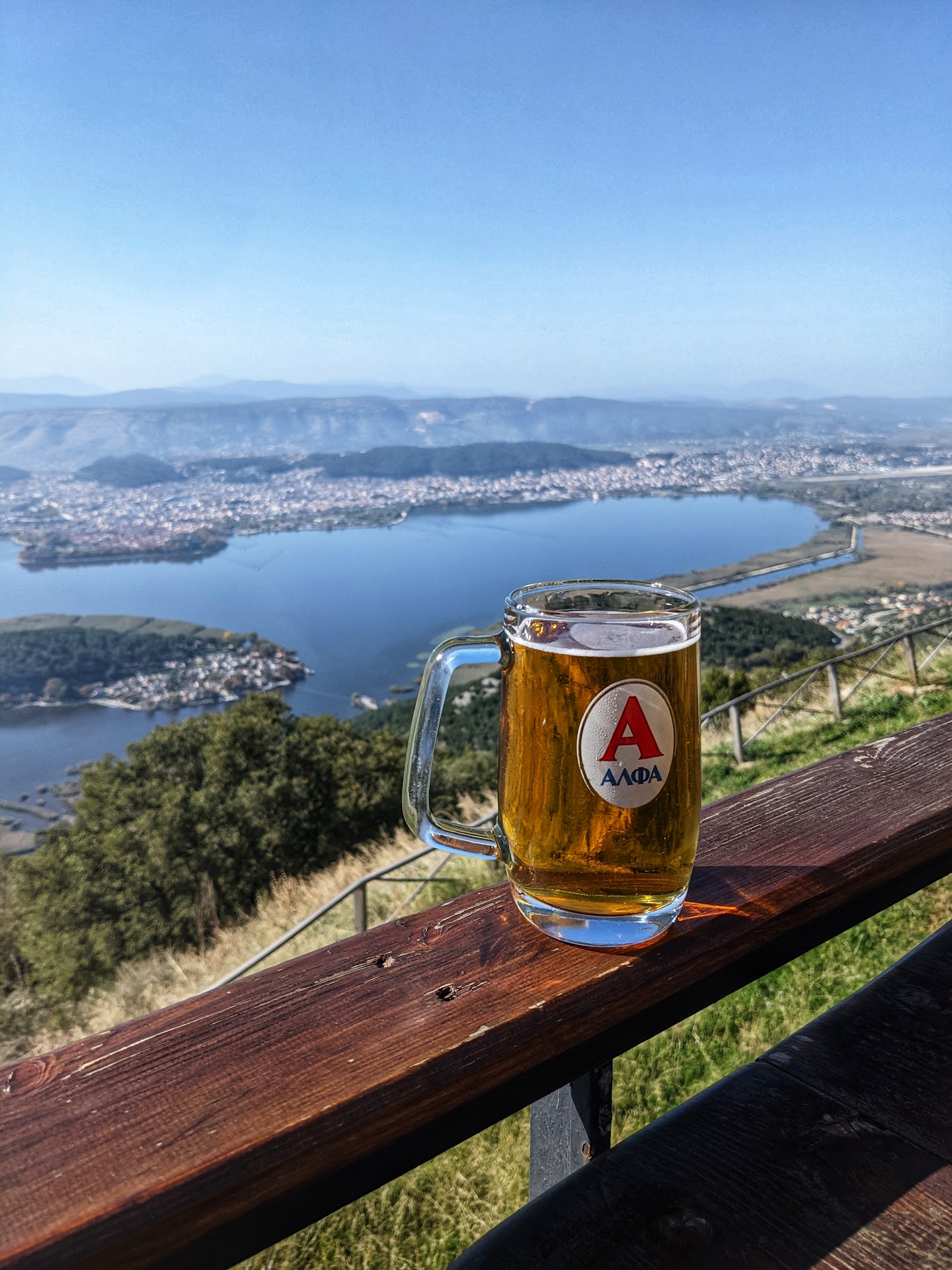Read moreVisited here for a drink to kill time before a restaurant booking and wow, what a view! I only had a beer so can't really comment on the coffee/other drinks or food (although they did serve dinner cups and sliced sausage to accompany the beer, that was very nice) but it's all about the view here. Just a wonderful view of Ioannina itself as well as the lake and Island. I had a Mamos draught but it was served in an Alfa glass, hence the Alfa glass in the photo. Service was very...