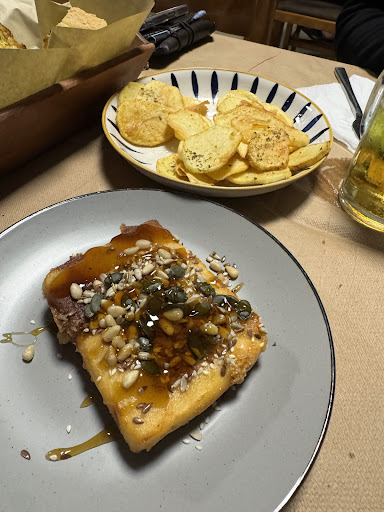 While ordering, I asked the waitress about the prices: eggplant — €6, octopus — “€8” (she said it very unclearly, even after I asked again if it was "eight" she confirmed by pronouncing it as "eight" unclearly though 🚩).