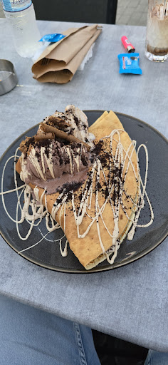 Καθησαμε Σάββατο μεσημέρι 3 ατομα 40 λεπτα πριν παρουμε το ferry για απέναντι. Παραγγειλαμε 2 κρεπες οι οποίες ήταν νόστιμες , έχουμε φαει και καλύτερες αλλού. Οι κρεπες ηρθαν σε 25 λεπτά και τις φαγαμε στα γρήγορα να προλάβουμε. Το μαγαζί ήταν άδειο στον εξωτερικό χώρο και άλλοι 2 έτρωγαν μέσα. Μας ειπαν οτι δούλευε πολύ με πακέτο. Στο διάστημα αυτό ήρθαν οι φιλοι μας , οικογενεια 4 ατομων, που μένουν 20 χρόνια Στύρα να μας χαιρετισουν για 15 λεπτά μέχρι να φύγουμε. Δεν ηθελαν να παρουν κατι, ενα γεια να πουν. Καθησαν , θυμιζω το μαγαζί άδειο, και ο ιδιοκτήτης με ύφος χιλίων καρδιναλίων τους λέει ΔΕΝ ΜΠΟΡΕΙΤΕ ΝΣ ΚΑΤΣΕΤΕ ΑΦΟΥ ΔΕΝ ΘΑ ΠΑΡΕΤΕ ΚΑΤΙ. Συμπεριφορά ΑΝΤΙΕΠΑΓΓΕΛΜΑΤΙΚΗ, ευκαιριακου μαγαζατορα ελληναρα που κανει αρπαχτηγια δυο-τρεις μήνες καλοκαιρινής σεζόν. Οι φιλοι μας εφυγαν , κατσανε ορθιοι παραπερα και μας περιμεναν,. Προφανώς ο ιδιοκτητης προτιμάει τη δυσφήμιση ειδικα απο αυτους που μένουν εκεί. Βαθμολογία 4 για την κρεπα και 0 για όλα τα άλλα , μέσος όρος 2. Εννοείται οτι δεν ξαναπαταμε, υπαρχουν τοσα άλλα...