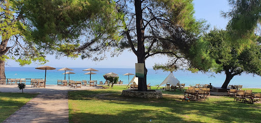 This place is completely different than any other place: -you have a large parking area to leave your car, most of if under shaded pine trees. -there is an outdoor restaurant with a large yard of green grass, again partially in shade overlooking the sea. You may walk barefoot on the green grass looking at the blue/turquoise sea! -going down to sea level, you will find sunbeds and umbrellas: -- first row toward the sea: a tent with 2 or 3 sunbeds = 30 €. This is purely rental cost, no drink voucher. -- second row, umbrella and 2 sunbeds =20€, same conditions as above. there are some speakers playing music, sound levels are decent, music played was mostly instrumental/electronic like Jean Michele Jarre, Enya or calm nature sounds blending perfectly the cicadas' noise from the trees.