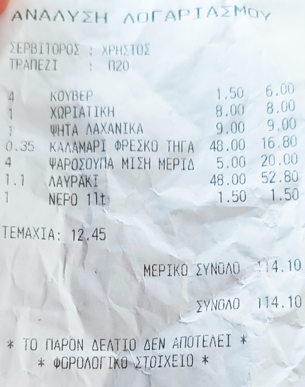 Read moreWe just had our first time ever family lunch at this place. We were satisfied with the possibility to book it online. We were welcomed well and the service initially looked good. We believe that this restaurant inside the menu card must have clearly marked prices for all the items e.g. per kg of the fish so we could easily decide what and how much to order. The sea fish was prepared fresh. We received the ordered meal quite soon, however we got confused when instead of individual small portions for a single person we got two big family portions of kalamari and grilled vegetables. While ordering we clearly mentioned we need the small ones and we asked the waiter to repeat what we ordered. Having in mind that the portion of the grilled vegetable was literally made of one grilled eggplant, one tomato and one paprika served on a big plate, we drank only one bottle of the normal water, and had 4 fish soups, as well as a shared portion of a grilled sea bass we believe the price of 114 Eur is overestimated. The feeling we got is the staff makes guests tricked regarding their orders and brings what was not explicitly ordered, most likely to charge guests more. Instead I would expect the waiter to ask us if we want bread and the water. Having said that, I did not leave any tip and do not recommend having a meal...