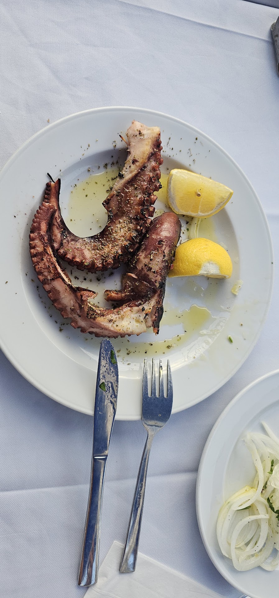 I know is lower than others ratings but I will explain why. First of all we arrived and we stayed where they told us. After that we stay 5 minutes without anyone from the staff to talk or ask something. Meanwhile other table just near us was occupied and they bring them water, glasses and other things who are part of cover. After 5 minutes as I already mentioned they bring us also and they give 4 menus, we where 5 people at the table, one of the menu it was only in greek. We managed of course with 3 menus. What I mentioned until this point it's only because what happened after :). We order 8 dishes, 2 as starters, spiced cheese (Tirokaftery) and cheese with tomato at oven (Bouyourdi) to serve with bred already brought to the table and prepared with olive oil and oregano I think. Also we order 2 portions of grilled octopus, one mixed grill, one souvlaki, one grilled fish and, because they told us this will came without garnish, we order grilled vegetables. Also some rose wine After a while they bring the drink and start to bring also the food. They came with starters but olso with one portion of griled octopus. After 5 minutes they bring mixed grill and souvlaki, after another 3 minutes, second portion of octopus and grilled vegetables. The fish was bring to us after 20 minutes, even if I asked where it is when they bring grilled vegetables. We refuse the fish because we already eat what was on the table. This wasn't all. The octopus was not cleaned well so we must clean ourselves in the plate, it came with some skin's and black liquid in the sack. The taste was good but it wasn't a good experience, we did not expect to have that in mouth. After first taste we understand is not what we want, we eat anyway but not all. Souvlaki was made of pork and was hard and some of the pieces like chewing gum, cannot be swallowed. Mixed grill was good Grilled vegetables was good Fish we don't know :)) Tirokaftery and Bouyourdi good. Rose wine was also good. I'm sorry to give such a poor evaluation to this restaurant who have good ratings but with this experience I cannot give more. Hopefully it was...