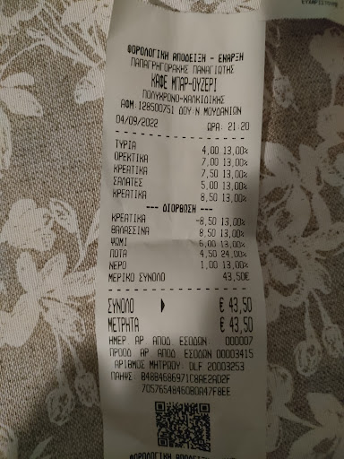 My friend and I ordered a Greek salad, bougiourdi, kebab, and a delicious round-shaped dish (I can’t remember the name exactly) served with tzatziki sauce — everything was absolutely mouthwatering. We also had ouzo, beer, and pineapple juice. The total bill was just €50, which is incredibly cheap considering the quality and taste of the food. Honestly, everything we tried exceeded our expectations. The food alone deserves a 1000% recommendation!