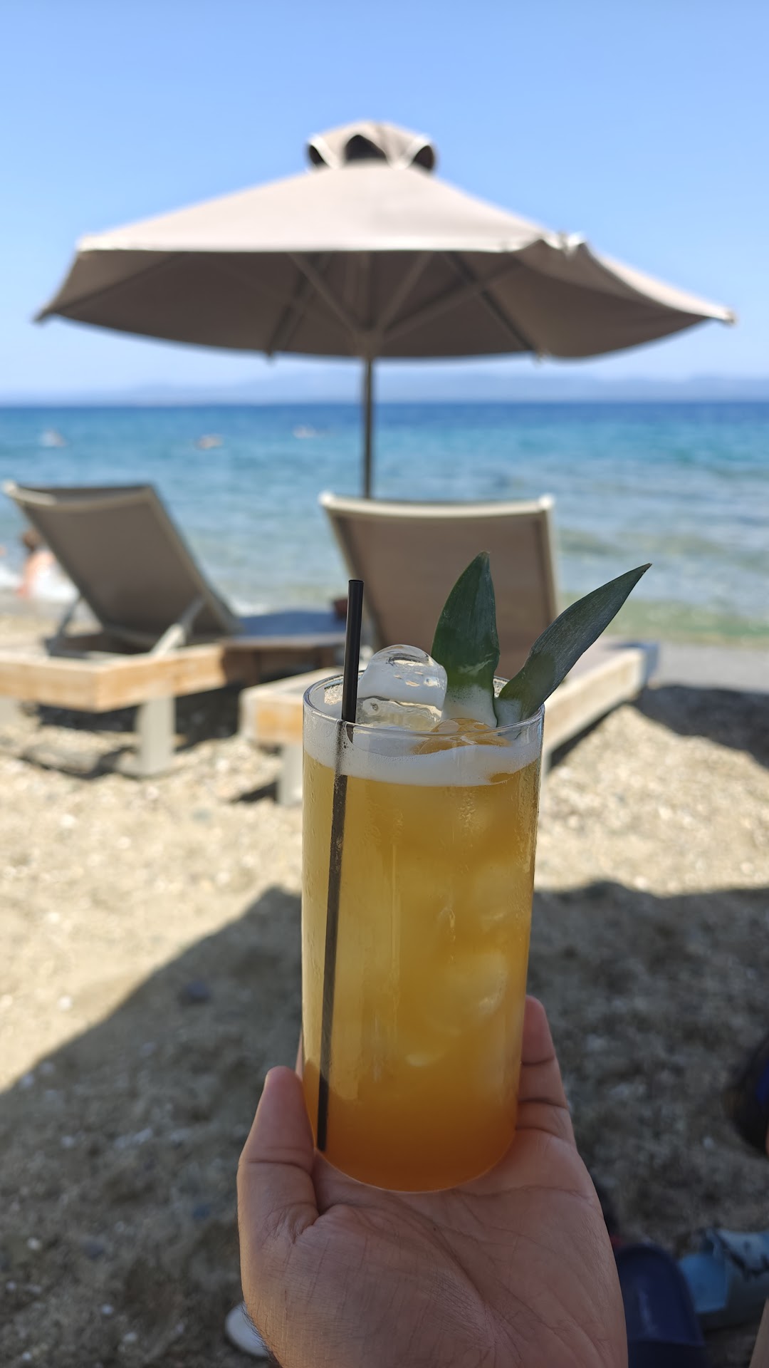 Sunbeds are priced at €30 for a set of two with one umbrella, and the entire amount is credited towards your orders at the bar (food, drinks, etc.), which makes it a good value compared to other places. The menu has a good selection of drinks, coffees, and food options, and everything we tried was fresh and tasty.