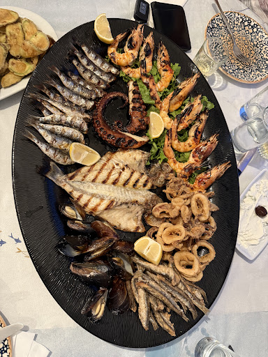 Secondly, the food was sub-par at best. Dips were tasteless, and the breaded feta wasn't of good quality. The halloumi was not grilled enough either. We brought a seafood platter for a main course, king prawns were ok, fried anchovies were bland (which is especially strange considering it is a salty fish by nature), grilled sardines were ok. The grilled squid and fried calamari was ok, nothing special.