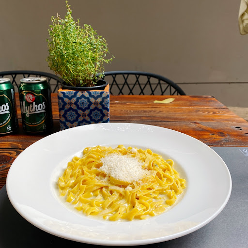[TUR] Makarna sevenler burada mııı? Evet diyorsanız burası tam size göre. Pasta e Cocktail Bar küçük fakat sevimli bir yer ve makarna, Uzakdoğu yemekleri, kokteyl servis ediyorlar. Menuden makarnanızı ve sosunuzu seçip kendi makarnanızı oluşturabiliyorsunuz. Fettuccine, Tagliatelle, Tortelloni gibi makarna çeşitleri ve pesto, peynirli, bolonez gibi de sos çeşitleri var. Cheese lover soslu Fettuccine ve Pesto Rosso soslu Tagliatelle seçtik ve ikisi de muhteşemdi. Yanında da tabiki lokal bir bira olan Mythos’u tercih ettik. Fiyatlar normal fakat İngilizce menüleri yok. Sanırım oranın sahibiydi, bir tek o İngilizce...