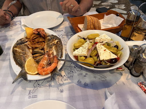But we persevered and went back a Few days later They now have wasp bait as they put out prawn heads for them on a plate away from the tables We had mixed fish for 34 euros Sea bass anchovies squid and prawns ( think squid was frozen) Greek salad and water and beers 50 euros