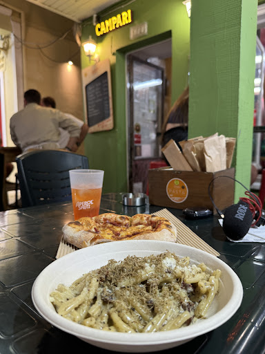 Edit: the owner insists we haven't had real carbonara before, we have. We know it's made with eggs, but not like this. Read your reviews, nobody likes it. I think you haven't had it before and you haven't eaten your own food. When we told you it's bitter, you didn't appologize, you only threw away the pasta. You hasn't tasted it, so how can you tell whether it's bitter or not? It was bitter, only the tagliatelle - obviously something was not right. You don't need to deny when you haven't tried it, you make a mistake and blame it on your customers for noticing it. It's crazy. Also we were not informed that it will take a long time. But we were reminded repeatedly to remove our own waters from the table without even offering a place where we can put them, so we had to put them on the ground on the street (we also ordered waters from the restaurant). Overall very rude, pretentious and disappointing. I'm removing the second star, one star for the small pizza is enough - it was good, but nothing special....