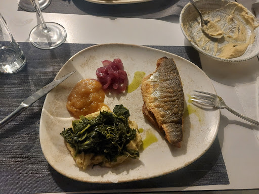 My 2 friends and I were on a trip around Lefkada to chill and enjoy the beaches. Someone recommended us this restaurant to try really good greek lefakdian food. At this time of our trip, I was at the end of my budget and haven't been eating fish to save. When I entered the restaurant, I knew that I had to try something here. I got the fried zucchini and fava bean purée. The fava beans was food enough to enjoy, but the zucchinis were really delicious. They had fennel and the shaves of zucchinies in the mix that made it taste exactly like my mom used to make them. Real Mediterranean feel. The star was the grilled sea bass though (i think that was the fish). Nevertheless it was amazing. It comes with a peach purée for the sweet taste, red onion marinated with vinegar for the sour, the grilled fish well spiced and salted, fava beans paste topped with a seaweed salad for the mild bitter taste, the plate is slightly dripped with a fennel and herbs green sauce that should connect all the element. Everything was well cooked and spiced and delicious together. You have the flexibility to mix all together and dose them as you like. It was extremely well made and delicious to keep the story short. If you have to be pedantic and picky, it would have made it art if there was a conducting element that connected the pieces together. But that's being too picky, i just wanna go and try what other things they have now. Oh and that is all for a very very modest price comparable with other tavernas on the island. Give it a try and you...