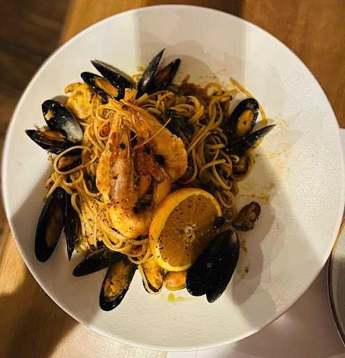 The food was no better. The bruschetta was soft instead of crispy, topped with an unexpected (and bland) pesto. My pulpo was sliced lengthwise which looked unappetizing. Two pale, floppy strips on the plate and half of it wasnāt even properly cooked. My table mateās seafood pasta came in a strange doughy shell that didnāt affect the taste but looked awful, like the shell had vomited the pasta onto the plate.