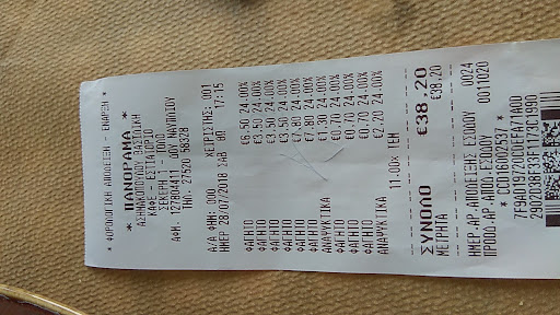 The receipt: 3.50 for chip 3.50 for tzatziki 6.50 a salad 7.80 for the fish 0.70 bread per person