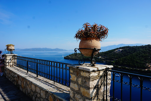 To work up an appetite for dinner, we recommend that you climb the long flights of steps up to the village where there is a large balcony with stunning views of the Ioniain sea (attached).