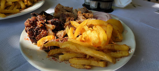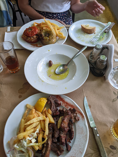 We easily walked over from our hotel kastraki after the sunset meteora tour around 7pm in late Oct and enjoyed prompt service and seating on the outdoor covered patio. Really loved the freshness of the greek salad and especially the feta block- so much yummier and less pungent than the crumbled feta you find in the US! The roasted eggplant dip was flavored and herbed sooo deliciously, we got toasted bread to accompany. Now I really wish we had gotten the tzatziki too cuz I'm sure it'd be great. Fresh orange juice was a beautiful deep orange color and tasty but sadly attracted flies to die in it, so drink that fast lol. Though the whole place smelled amazing cuz of the outdoor grill area, I thought the pork souvlaki w fries and the lamb ribs w fries were just ok- advertised to be tender as heck but actually were a bit chewy. Definitely no sous vide tender lol. I was honestly full after eating all the bread and amazing eggplant dip anyway so I cut up my leftover pork souvlaki and fed it to the super well behaved stray dogs who know to wander up to the guests and sit and yield for meaaat! Staff and owner seem to know the lovely dogs and all the guests were taking turns feeding them meat as well. Owner was grilling everything inside the grill area but came out and offered shots of raki (?) Oh god that stuff kills me I can't. Ambience was overall so great and fun from all this that I would come back and try ordering the roast chicken dishes that others rave about, then get more dishes, and maybe feed the...