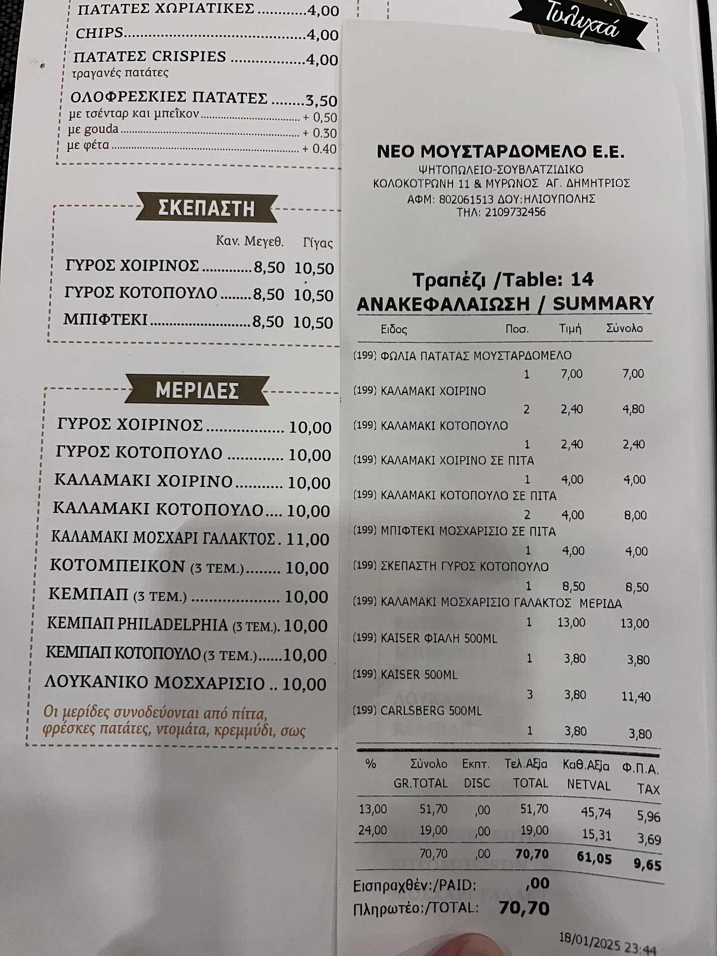Παραπλανητικός κατάλογος και κακή εξυπηρέτηση προσωπικού. Χθες το βράδυ 18/01 επισκεφτήκαμε το συγκεκριμένο μαγαζί μια παρέα 7 ατόμων. Όλα καλά με το φαγητό (ωστόσο σχετικά μέτριο), αλλά αυτή η κριτική αναφέρεται στο τι ακολούθησε αφού ζητήσαμε τον λογαριασμό ώστε να αποχωρήσουμε. Όπως θα δείτε στην φωτογραφία, η μερίδα μοσχαρίσια καλαμάκια στον κατάλογο κοστίζει 11€ ωστόσο στην απόδειξη που μας έφεραν είναι κοστολογημένη στα 13€!! Ενημερώσαμε ευγενικά τον σερβιτόρο για αυτό το λάθος, και όπως είναι φυσικό περιμέναμε να ακούσουμε μια απάντηση που να φανερώνει σωστή εξυπηρέτηση τύπου «μας συγχωρείτε για την παράλειψη, θα το μεταφέρω στον υπεύθυνο για να κάνει τις απαραίτητες διορθώσεις, το σωστό σύνολο σας είναι ## τόσο.» Ωστόσο ο σερβιτόρος μας απάντησε «ε καλά εντάξει, πληρώστε με και θα σας φέρω 2€ πίσω» με ύφος. Ανήκουστο!!! Και είστε παράνομοι, καθώς είναι περίπτωση παραπλάνησης καταναλωτή και κατ’ επέκταση σας προτείνουμε να συμβουλευτείτε τον αγορανομικό σας υπεύθυνο, ΚΑΙ δεν ξέρετε τι πάει να πει εξυπηρέτηση!! Είναι δυνατόν να σας επικοινωνούμε ένα δικό σας παράνομο λάθος και εσείς να μας απαντάτε με αυτόν τον τρόπο;;; Ή δεν εκπαιδεύσατε τον συγκεκριμένο σερβιτόρο ή συνολικά σαν μαγαζί δεν γνωρίζετε τις σωστές αρχές εξυπηρέτησης πελατών! Η κριτική αυτή δεν θα γραφόταν εάν δεν μας έκανε εντύπωση η τόσο κακή εξυπηρέτηση. Εάν ο σερβιτόρος είχε χειριστεί το θέμα διαφορετικά και με σωστές αρχές εξυπηρέτησης πελατών, το θέμα θα είχε λήξει εκεί. Ωστόσο μάλλον είναι πολιτική σας να χρεώνετε διαφορετικά πράγματα από αυτά που αναγράφονται στον κατάλογο ή σας παραγγέλνουν, διότι ανάμεσα στις μπυρες που παραγγείλαμε ήταν και μια ΦΙΞ άνευ η οποία είναι φθηνότερη από τις κανονικές μπυρες αλλά εσείς μας χρεώσατε μια κανονική. Δεν είναι το θέμα για τα 0,30€, είναι για την λανθασμένη πολιτική σας να εξαπατάτε τους πελάτες σας. Προς όλους τους επισκέπτες του συγκεκριμένου μαγαζιού λοιπόν: ΠΡΟΣΕΞΤΕ ΤΙ ΠΑΡΑΓΓΕΛΝΕΤΕ ΚΑΙ ΤΙ...