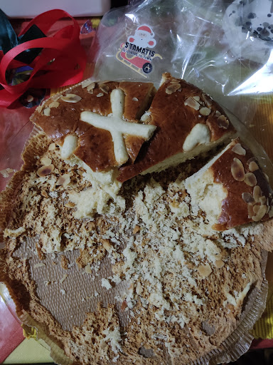 Read moreΉρθαμε την παραμονή να πάρουμε βασιλόπιτα.. γιατί παλιότερα παίρναμε τσουρέκια και μας άρεσαν πάρα πολύ... Με ρώτησε η κοπέλα αν θέλω τη μικρή η τη μεγάλη αλλά ήδη κρατούσε τη.. "μεγάλη" στο χέρι της.. και προτίμησα αυτήν γιατί δεν μου φάνηκε και πολύ μεγάλη... Πλήρωσα 16€... Με το που ήρθα σπίτι την ζύγισα 860 γραμμάρια... !!!Κάπου εκεί μαζί με τις ζελατίνες και τις κορδέλες.. δηλαδή 20€ το κιλό.. ??και μαζί η χάρτινη φόρμα που ήταν ψημένη η βασιλόπιτα την οποία την είδαμε στο κόψιμο... Μεγάλη αστοχία αυτό γιατί δύσκολα κοβόταν και δεν έβγαινε από το χαρτί εύκολα... όπως και το φλουρί κολλημένο στο χαρτί...Από γεύση.. απλά καλή.. το μείγμα που είναι γραμμένα τα γράμματα δεν τρώγεται...είναι πάρα πολύ σκληρό...Άρα με το ζόρι 700 γρ. η πίτα...🫤Του χρόνου...θα πάω σε φούρνο της γειτονιάς μου ..πεντανόστιμη με 13 ευρώ...