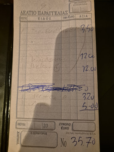 So this one attracted us as it had a genuine wood fired pizza oven. This always adds extra flavour. We ordered peach ice tea and a local beer. They had run out of mythos as it is near the end of the season. I ordered a large inferno pizza with cheese toast. Also we ordered carbonara. The waiter also bought us some warm pitta bread with olives and olive oil and balsamic vinegar. The service was perfect and they kept checking we were OK. After the meal the waiter bought us some small chocolate cake as a freebie. Definitely coming here again in the new season. Very good...