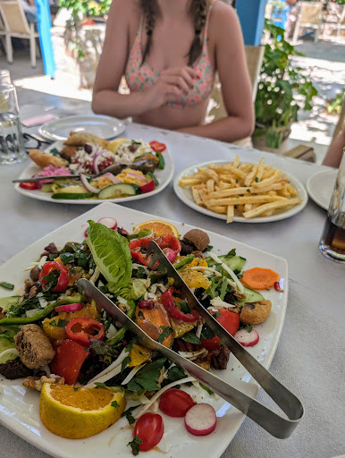Eravamo stati parecchi anni fa a cena a questa bella taverna, sulla spiaggia e sotto i tamerici della bella spiaggia di damnoni e ci eravamo trovati benissimo poi purtroppo negli anni successivi avevano preferito aprire solo per colazioni e pranzi e non anche per cena e non avevamo avuto mai occasione di venirci...aspetta aspetta, anno dopo anno, finalmente quest'anno veniamo a sapere che il locale ha riaperto anche di sera e quindi una sera di fine giugno siamo tornati con grande piacere...la storia delle 3 taverne attigue sulla spiaggia di damnoni è nota ma curiosa, praticamente nei lontani tempi passati vi era una sola taverna gestita dal patriarca Violakis, ereditata poi dai tre figli che hanno preferito creare tre taverne diverse, gestite autonomamente sempre in modo familiare da ciascuno di essi...avevamo letto che la taverna posta al centro, la Mesogeios appunto, gestita da Stavros Violakis, era quella maggiormente rispettosa del cibo tradizionale locale mentre le altre due risultavano essersi più adattate agli assopiti gusti "nordici" degli ospiti tipo del vicino villaggio svizzero Hapimag...avevamo scelto ovviamente il Mesogeios e ci eravamo trovati benissimo e quindi quest'anno, con la riapertura serale, siamo tornati con molto piacere...dal menù, molto interessante perché presenta anche piatti diversi dai soliti che si trovano in una taverna greca, abbiamo ordinato dal menù ordinario il baccala fritto con patatine (€ 12,50) e dai piatti del giorno la seppia con gli spinaci (€ 12), e, l'idea era di aggiungere i "gigantes" ossia fagioli grandi e carote stufati e il "briam" ossia mix di verdure quali zucchine, melanzane, peperoni, cotti anch'essi al forno, entrambi proposti con sopra sbriciolata la myzitra...ma il buon Stavros, onesto come pochi, ci ha "stoppato" perché sarebbe stato troppo un tale ordine per 2 persone e ci ha consigliato semmai di prendere mezza porzione di gigantes (€ 5,50) e mezza di briam (€ 5,50)...mai consiglio fu così ben dato, i piatti erano davvero super ricchi e molto abbondanti, assolutamente completi quelli di pesce perché comprensivi di bel contorno e quindi se avessimo preso le porzioni intere dei due piatti di verdure stufate, avremmo finito inevitabilmente per lasciare parecchio cibo...come nella cena di anni addietro, sapori intensi e squisiti, ingredienti freschi e di qualità, cucinati con sapienza e rispettosi dell'antica storia di papà Violakis...un gattone dalla faccia da brigante ma molto riservato ci ha educatamente accompagnato accoccolato sul muretto per parte della cena...ottimo anche il mezzo litro di vino bianco della casa (€ 6), probabilmente il migliore della vacanza, offerta anguria e un raki al miele e ci è parso anche limone, davvero delizioso...con acqua e pane (€ 1 a persona), spesa finale € 43,80, davvero meritatissimi! al...