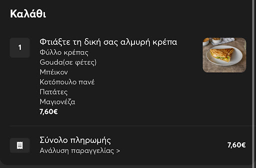Read moreΠαράγγειλα μια αλμυρή κρεπα με κοτόπουλο πανέ μπέικον τυρί πατατες και μαγιονέζα. Πέρα από το ότι έκανε 1,5 ώρα να έρθει ενώ είναι κοντά το κατάστημα με το σπίτι που έμενα η κρέπα δεν είχε καλή γεύση και ήταν χλιαρή. Τα υλικά δεν σου θύμιζαν με τίποτα αυτά που παραγγελίες, η ζύμη της κρέπας μέτρια, το κοτόπουλο πολύ κακή γεύση, η μαγιονέζα οκ το τυρί μέτριο και οι πατατες άγευστες…μόνο το μπέικον σου θύμιζε όντως μπέικον…Σαν κρεπα ήταν μεγάλη & είχε αρκετή ποσότητα υλικών δεν μπορώ να πω ψέματα αλλά μέχρι εκεί. Δεν θα ξανά παραγγείλω. Γενικά δεν μου αρεσε καθόλου και περίμενα και τόση ώρα για αυτό το… δυστυχώς ενώ γράφω πολύ κόσμια την κριτική εδώ και δυο μέρες το Google δεν μου...