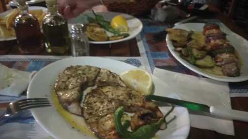 We were two people and had: • 2 small sodas each • Tzatziki with bread • A Greek salad • A small plate of fries • Grilled king prawns (starter) • Grilled tuna steak • Grilled sea bass • Complimentary raki and a small dessert after the meal