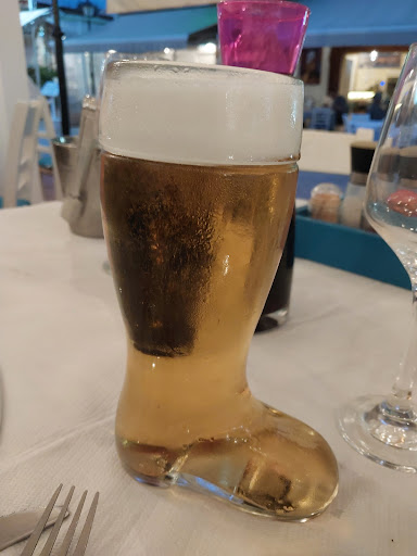 We had already decided to give this place a try but were quickly pounced upon but the staff rounding up custom- this was very unlike the other more laid back tavernas nearby. The bread was quite dry and processed and I suspect charged for. We had dakos, which was fine, and meatballs, which were a bit dry and processed and then an uninspiring moussaka and a single stick of souvlaki. The beer in a boot was amusing and we ordered a carafe or wine and were then given a free one which was generous but we really didn't need it! The service was super quick, in fact too quick as we were then left with a cafare of wine to drink after finishing! We couldn't help but wonder if this is a tactic to keep the restaurant busy...