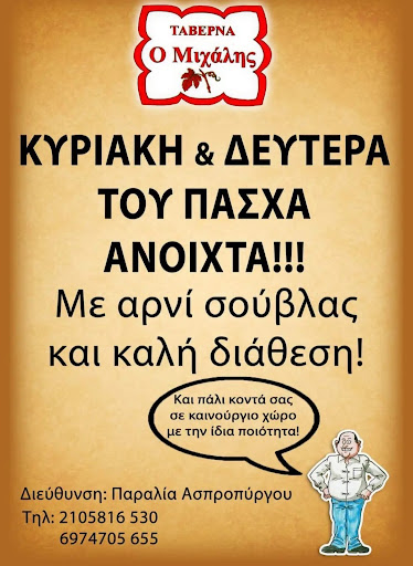 Η Ταβέρνα Ο Μιχάλης μεταφέρθηκε στην παραλία Ασπροπύργου.(από Χαιδαρι που ήταν) Συνεχίζοντας την παραδοσιακή Πολύ Καλή Ψησταριά-Ταβέρνα με εκλεκτά κρέατα που διατηρούσε πολλά χρόνια...