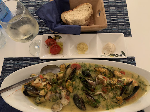 We were expecting to taste more or less the same dishes one can find in every Greek island, but we were surprised by the unique tastes. At our first visit the chef, Mrs Maroula, came to our table and informed us about several distinctive dishes she and her team could prepare for us, thankfully it was early in the evening and the restaurant wasn't yet crowded so she had the chance to talk to us. We were intrigued by her description of the homemade pasta with fresh fish and mushrooms, as we are familiar with eating pasta with lobster but never had tried it with fish. When the dish arrived it was beautifuly decorated and by the first bite we were amazed by the taste. We had never thought of combining mushrooms with fish, and the taste of earth and sea was unique. We visited the restaurant for dinner the following evening, wanting to taste more, and we ordered fish soup and seafood saganaki. The fish soup was not like any other fish soup we had ever tasted, as it was made to resemble a traditional Greek Easter soup which is usually made with lamb. Again we were happily surprised by the imaginative combinations of ingredients and tastes, smiling with delight at every bite. When the seafood saganaki came to our table, we noticed it wasn't made with the typical red sauce as most saganakis' are, but it had white sauce, which we had never thought of before. The seafood was delicious, but the sauce was even more, and although we were already stuffed by the starters and the fish soup, we sipped every drop of the sauce in the plate. After that, we decided to visit the restaurant for the third (and unfortunately last) evening at Astypalaia, this time having preordered homemade stuffed pasta. That dish was an ode to simplicity, very few ingredients but yet marvelously tasteful. The pasta was immaculately boiled and the sauce was so light that it allowed us to taste the stuffing of the pasta. We also had bruschettas with fish, made by the Italian chef also working in the restaurant, which were very tasteful.
