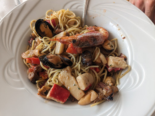 The seafood spaghetti looks great but tastes awful. The seafood is not fresh at all: cuttlefish and mini octopus stink, Surimi tastes only like starch, shrimps and mussels must have been in freezer for very long time. The big problem is: they are ripping off tourists whenever they get a chance!!! I was on the bus from port to Nissaki. Even if I showed the ticket seller in bus the location of my apartment on Google map, he insisted I should get off at station Barmpati, which was directly in front of this restaurant. I walked into this restaurant for nice view. After eating, I showed waitress the address of my apartment and asked how much it may cost to take a taxi for 2,9km. The waitress said she has no idea but would call Taxi for me. Suddenly I was told it costs 25€ for 2,9km and had to decide instantly because the driver is on the phone. I was unsure but the waitress said that it's the normal price for a Taxi in Korfu. However, there came a mini van without Taxi shield. It all happened too quickly. Later I realized they didn't call Taxi but their friend. And there is a bus station 150m away from...