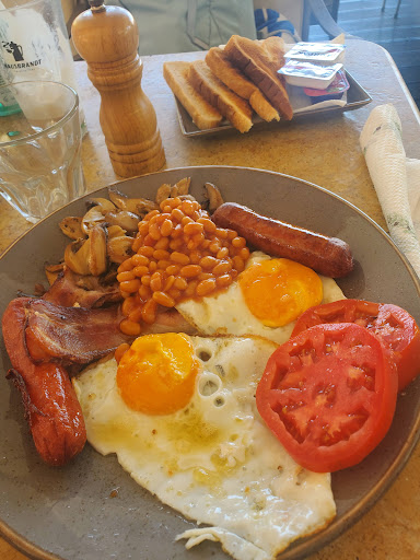 We liked this place. It was 2 pm and I wanted breakfast food. My husband wanted lunch. They had both. The menu was extensive and I had some difficulty deciding between all the eggs, omlettes, waffles and croissants! I had a freddo cappuccino (iced) and it was so good I ordered another. My husband enjoyed his sandwich and fries too. Pictured here: English breakfast and...