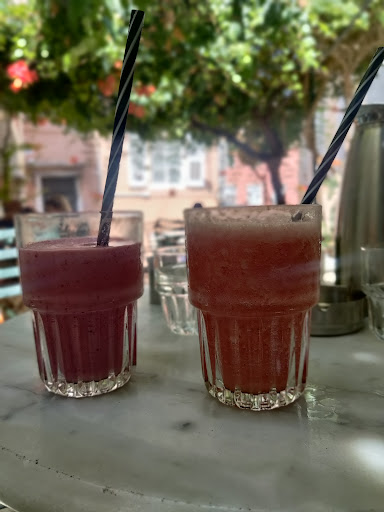 We got a free water at the beginning, which was extremely nice since it was really hot. The environment is really beautiful, you can sit under a blossoming roof of ivy. The smoothies were delicious and refreshing. The prices weren't very high for a city centre.