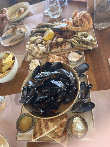 A very nicely furnished restaurant right on the beach. The restaurant has very plush sunloungers to rent for a reasonable fee - the beach attendant is very friendly, efficient and caring of families. We also chose to eat in the restaurant. Service here is great, just was a little slow. Thankfully the venue itself and views over the bay help the time go by. We had a fish platter for two and ordered oven baked feta and fries as extras (not necessary). Fish platter was a huge and very delicious plate of sardines, prawns, mussels, squid, swordfish and fried anchovies - absolutely worth the money!
