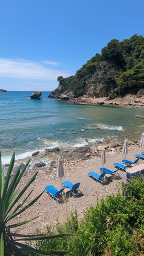 The beach is perfect and really great for swimming! Sunbeds are €10 for 2 beds and an umbrella if that’s your vibe - if it’s not, I struggled to find much space for a towel that wasn’t on stones / had any shade at all. Not somewhere I could’ve spent a full there therefore, but still lovely.