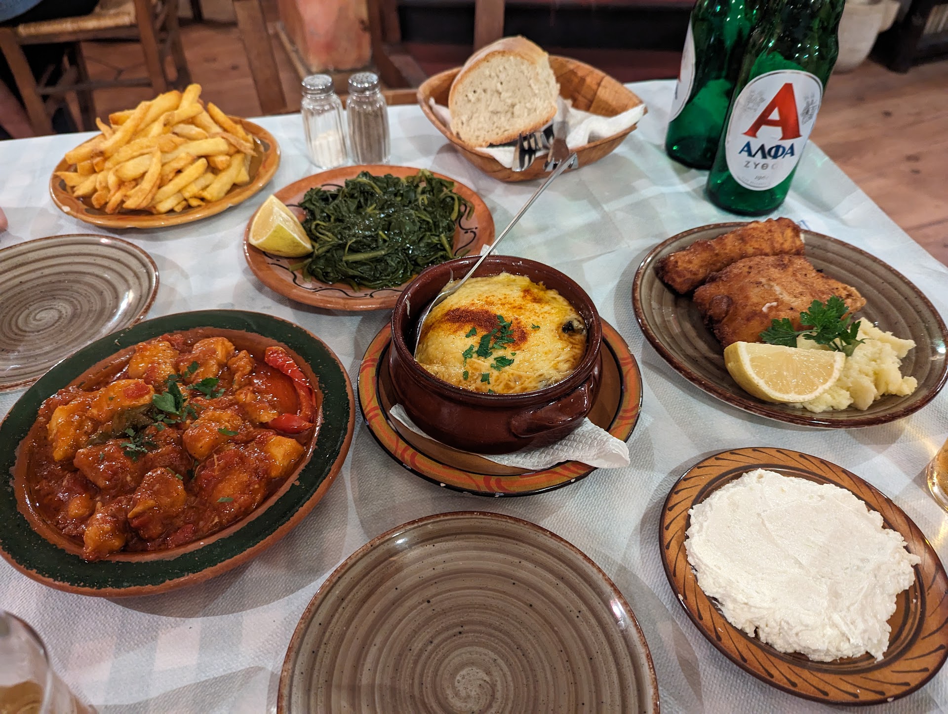 The food was hearty and very delicious. We had spicy feta dip (tirokafteri) and bread, minced beef and aubergine with cheese (a take on moussaka), battered cod with skordalia, boiled greens, chicken in a tomato and pepper sauce, fries, and some Alfa beers. Altogether including a tip this came to under €65, we couldn't believe how reasonable this was.