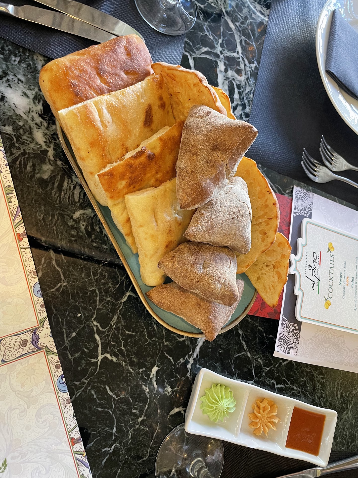 Με το καλημέρα μόλις κάτσεις σε χρεώνουν μπουκάλι νερό χωρίς να ρωτήσουν αν θες βρύσης κτλ. Αμέσως σου φέρνουν ένα πιάτο με ψωμάκια μόνοι τους χωρίς να ρωτήσουν και στο χρεώνουν και αυτό. Κατευθείαν μόλις κάτσεις έχεις μπει μέσα έξι ευρώ. Τα ψωμάκια συνοδεύονται από δύο βούτυρα και λίγο ζουμί ντομάτας που είναι μέτρια όσο δεν πάει και η σος ήταν περίεργα πολύ κρύα.