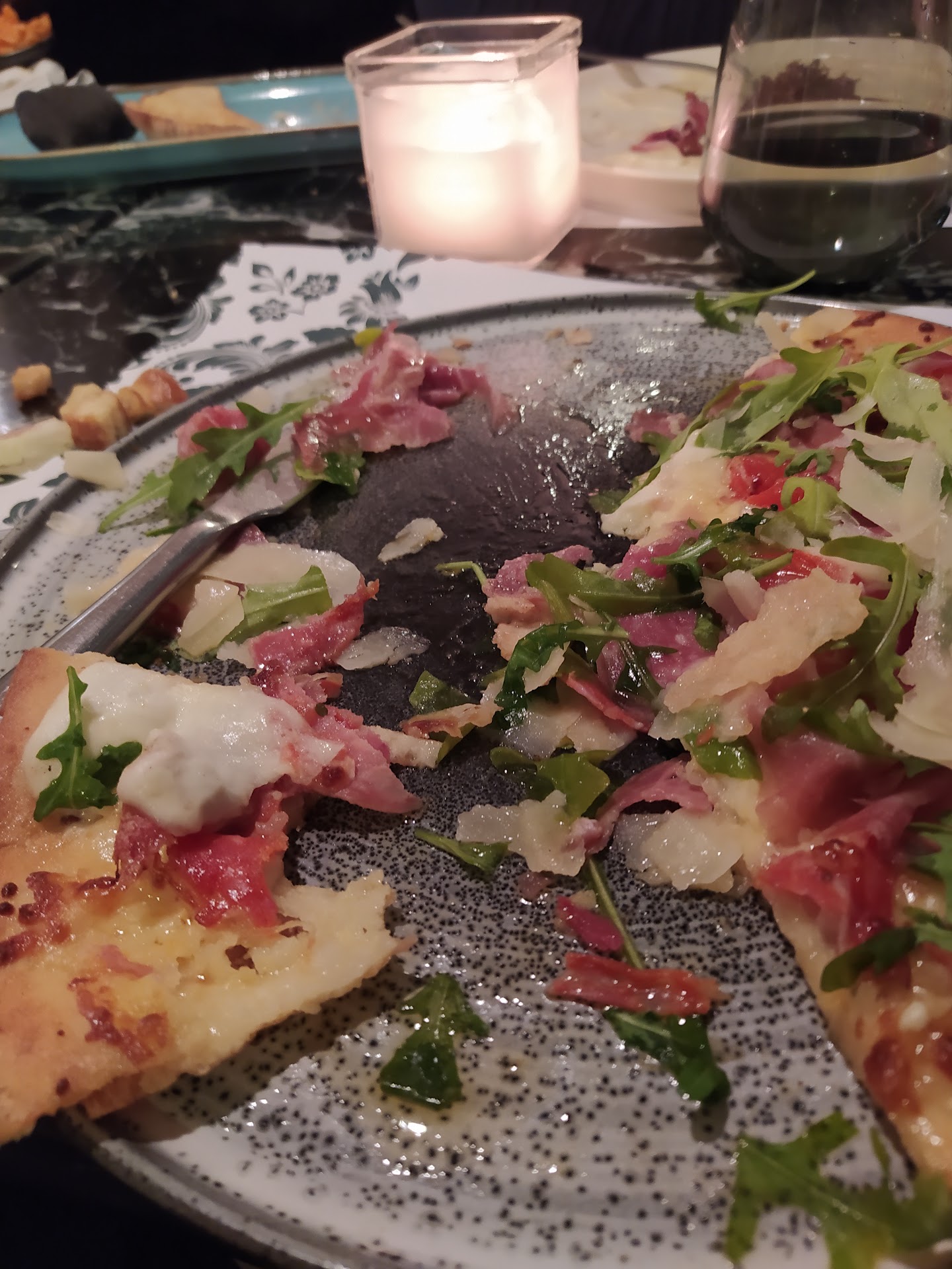 Πήραμε και μακαρόνια και πίτσα. Και τα δύο πολύ μέτρια. Η πίτσα δεν είχε σχεδόν καθόλου σος ντομάτας, μόνο στις άκρες λίγο για εφέ και έτρωγες σκέτο ψωμί με τυρί. Η ρόκα ήταν ασυνήθιστη, είχαν πετάξει πάνω στη πίτσα κάποια πολύ μεγάλα φύλλα, πράγμα που δεν έχω ξαναδεί ποτέ. Το ζυμάρι πολύ μέτριο, σαν της dominos pizza στο στυλ αλλά αρκετά χειρότερο στη γεύση και στη ποιότητα. Τα μακαρόνια τίποτα το ιδιαίτερο. Από άποψη σχέσης ποιότητας τιμής μάλλον είναι το χειρότερο ιταλικό που έχω φάει στη ζωή μου. Ένα θετικό ότι κέρασαν γλυκό, αλλά και αυτό έτοιμο τυποποιημένο ήταν τύπου Γιώτης αλλά προφανώς κάποια πολύ πιο άγνωστη και χειρότερη μάρκα. Δύσκολα το έτρωγες.