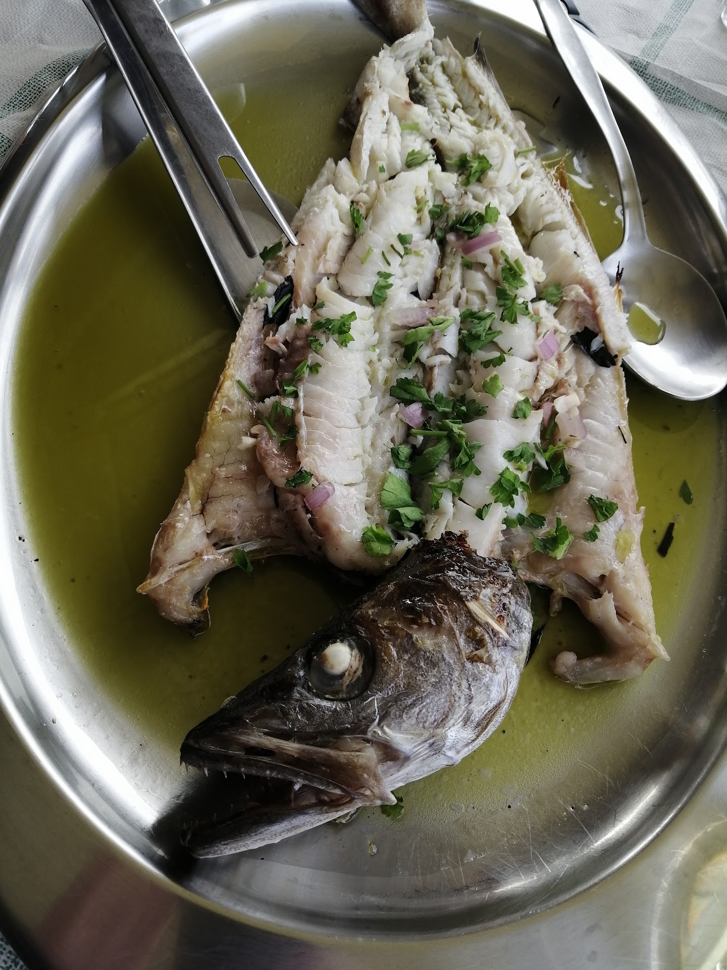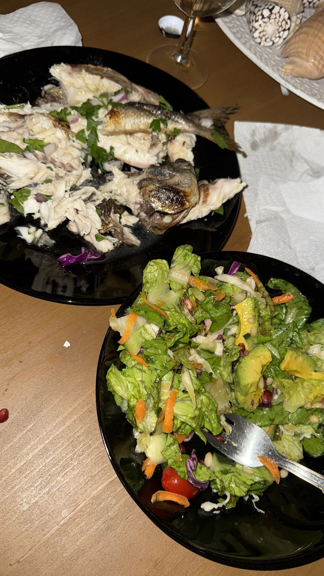 We told the owner that the fish was good but the salad was uneatable (and we left it mostly there), he came to check it and said that it was a totally fine salad and that it was just prepared, i mentioned that it was quite unlikely as even from the half cut lemon it was visible that it was not just made (where it was cut it was visibly dry giving away that it was prepared much earlier).