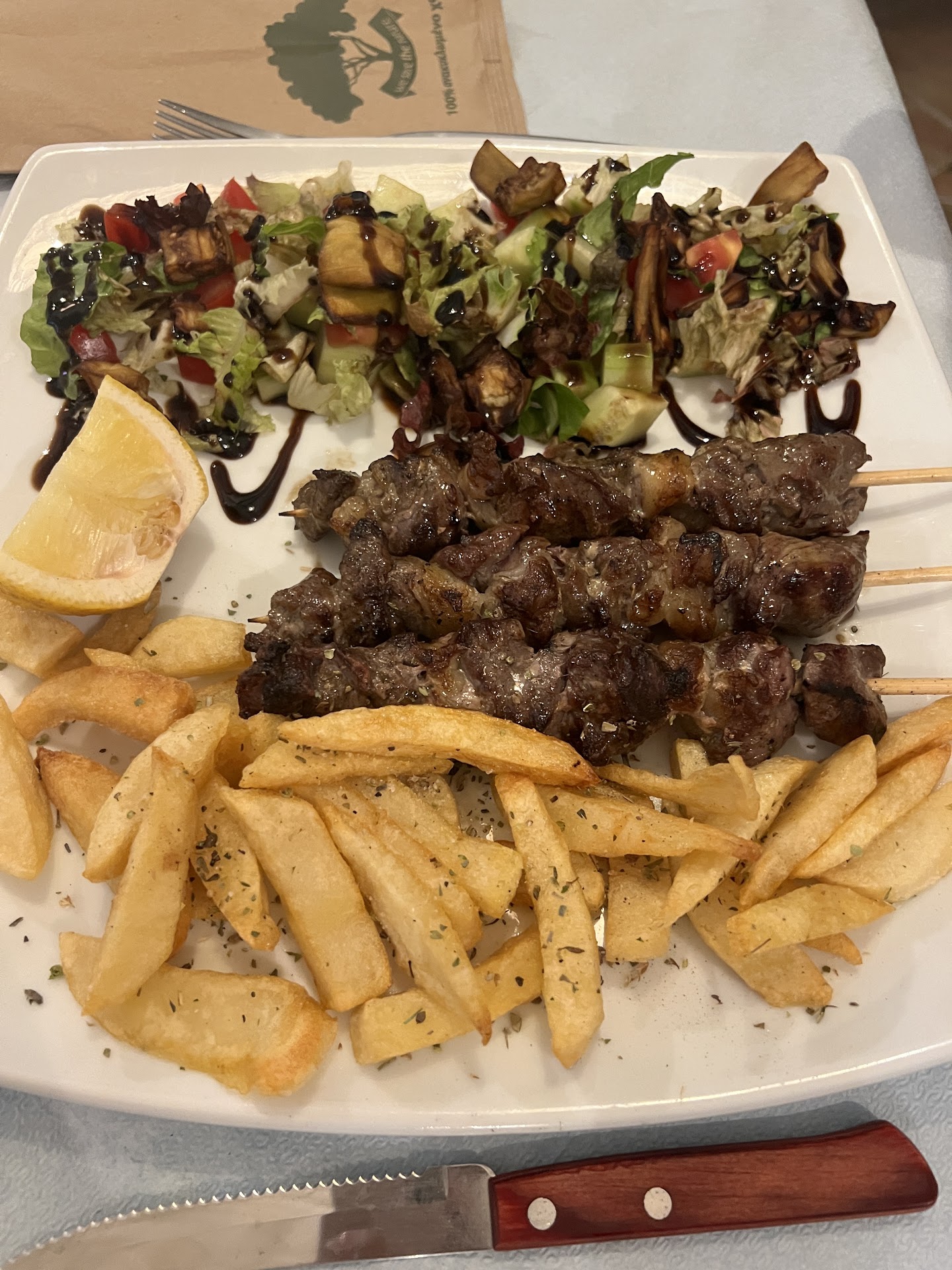 Two of the top foods in Crete are here. Hands down the best pita gyros in Crete. We have tried countless but none had the overall quality and cohesion as this one. Big difference is the pita they use. One of the waitresses told is that they use the old school pita bread (as opposed to most of the other gyros places). The dough is perfectly soft and they also grill it for the extra flavour. The balance of veggies, potato, meat and sauce is spot on. Must ask with tzatziki. The best we have tried in a gyros. Meat has a great flavour and the potatoes are perfectly fried but creamy soft in the inside. Really amazing!!! The next one is the moussaka… this one is also the best one (to our taste) on the island (and possibly in Greece). Well balanced, juice, has sufficiently strong flavours (some people might not like it). But believe me, it has the wow effect. The other moussakas of the island are far behind. Only one from the mainland is on par with it. Moussaka business is not an easy one! Again, this is only according to our taste. Hats off to this establishment. One thing caught our eye: while another couple got free dessert and raki, we didn’t. We had a moussaka with small greek salad, gyros and beer - maybe we spent under the threshold of giving free stuff. It’s understandable if people only ask for gyros but we were a bit surprised. Nevertheless the food and the warm service beats this...