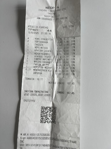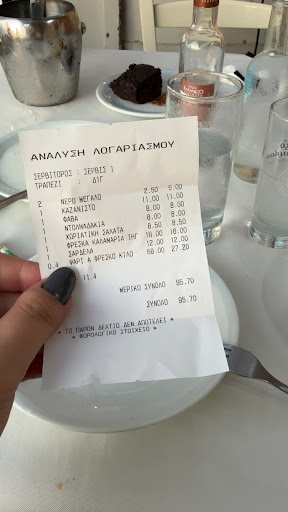 We ordered the following: -Cretan salad and Stuffed Zuchini : very good -Octopus in vinegar: below average, nothing to remember of. -marinated anchovies : was OK -Fried calamari : it was like chewing on Dunlop tyres, not eatable -Fried shrimps: they served with the shell, it was ugly and tasteless, terrible frying oil too. -fried red mullets: they promoted it as super fresh but the fish was too big and not for frying, they were about 8 minutes overcooked. just not worth it for 65 euros. -Grilled Anchovies: it felt like eating sand -Beef steak for a child: overcooked and rubber texture. The house white wine : was the worst wine I have ever drank in a restaurant. The waiter came to ask how thigs were; I said not great, then the manager/boss(?) arrived. He asked what was wrong , after i told him the issues with 2 of the dishes, he just left without saying anything and never came back. Even when I went inside to pay the bill, he passed by me and didn't ask or say anything.