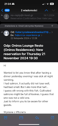 Last Thursday we got food poisoning after having a dinner. My partner had a pizza and I ordered salmon. I guess it was caused by a fish. It dis not smell and taste great, had a strange taste but I have eaten almost all and shared with my partner. All night was vomiting and the consequences are till today. Will check my blood tests tomorrow. And what to add on it that I have sent an email in regards to that situation the day after and no one replied. I sent email again 3 days ago and still no reply. So so not know what is worse, I guess lack of reply tells everything...