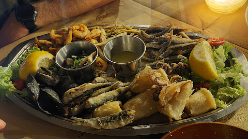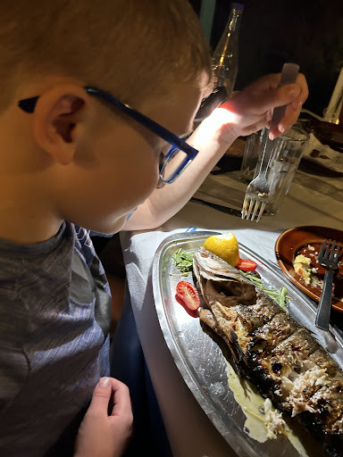 Reject the bread … it’s nothing special and for Group of 7 charged 1,50 per person euro for Bread and tomato paste. No olive oil. Had no idea the bread was brought to the table I wasn’t asked. Water bottle 2 euro each We asked for cuddle fish for my seven year old son 9,50 euro. Waitress said it has to soak for two days and it’s only been soaking for one day so she said it would be too salty and she did not recommend. So we thanked her and cancelled the cuddlefish. We were up-sold to the sea bass I asked the price and she said it would not be more than 23 euro for one fish. So we agreed as my 7 year old really wanted fish. The fish was good. We ordered grilled vegetables … they were burnt and overpriced. The fava bean was good. The Greek salad was the smallest portion of Greek salad I have ever seen served,