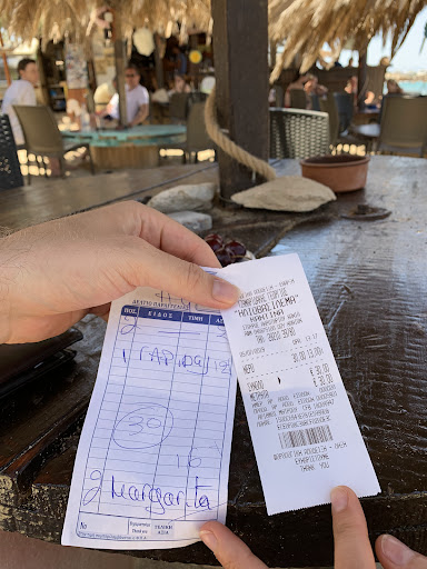 Drinks, food and prices We ordered the shrimp menu and two margheritas. The drinks were medium sized and had an average to good taste. The shrimps (only 6 pcs/pieces) were average to good too. We recieved a lot of bread to it. As it is common on the island you recieve two small drinks at the end. Eighter Raki or Limoncello. Usually you get a small bottle of it, in this case only two shot glasses accompanied with a few cherry fruits. The ugly thing about this was the price. It costed us EUR 30.00 wich is (to say it in the words of our places renter) a „robbery“. It is indeed unusual to charge that much in crete. This is not because i do not want to pay more for good food, but because with this price you usually recieve 500ml white wine, starter plates, main courses and desserts for two to three people. In the end we ate 6 medium sized shrimps with bread and two medium sized cocktails for EUR 30.-. Even in Switzerland where we are from this would be slightly too much..