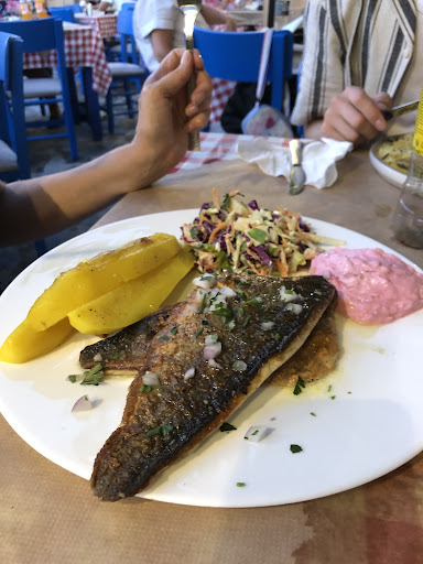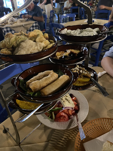 Read moreA game (restaurant) of two halves. The front is attractive traditional Greek blue and white to entice you in and the rear looks messy and dated with unhygienic football shirts and flags hanging everywhere - I read the explanation they give why but it looks scruffy and very last century! When I arrived there were 20 guests and 7 staff and yet service was slow. Two seemed to do all the work - the friendly guy that takes the orders and the good looking young runner that brings all the food out. The lady greets and seats guests and the other 4 stand around watching intimidatingly but avoiding any follow up service! Got busier later but the same two did the most. The menu design and layout looks like it was done by a 12yo on a word processor 20 years ago which is a shame because the presentation of the food is really attractive and modern. Just don't come here for your 5 a day as everything comes with fries or rice or potatoes and salad. I asked to swap for vegetables but they don't do them! That said the food was really good and the house wine also good. Free dessert was appreciated and prices were reasonable. Hope they update the menu and decor for 2022. Could be outstanding with a few simply fixed areas for...