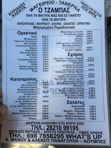 This place is amazing! Not only are the prices at this restaurant are less than half of any other restaurant in town, but the portions are at least twice as generous! The quality of the food is excellent and the service is lightning fast. This establishment is heavy on meat, but they also feature a few fish items that are well prepared. Even vegetarians can find something to satisfy them. Their Greek oven potatoes (a generous serving for 2.50€) are some of the best we’ve had in Crete. Tzambas is frequented mainly by locals - the location is off the beaten tourist track. But I cannot see how a place like this can remain a secret for long. My wife and I recently dined there with two friends. We ate until we couldn’t eat anymore (we had to take leftovers home). Plus we had a liter of wine. The check came to 20.90€! Today my wife and I at there alone an paid 16.20€ - and took home containers of food and shared a half liter of wine! The wine was 2€! A bit of trivia: the word “tzamba” means “nothing” or “free” in Greek. This is about as close to free as you will ever find in a restaurant - a restaurant that doesn’t compromise on quality...