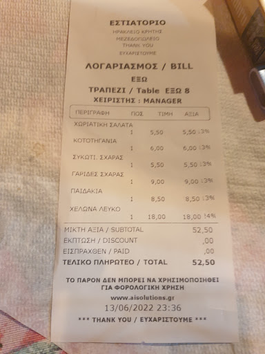 I'd spotted this place on Google Maps, and it had subsequently been reccomended to me by some local bar owners, so I was keen to try it out. It was 6.39 and still fairly early for dinner so I was the first to arrive. The decor is a mix of Swiss chalet, Tree-house and tavern-in-the-woods, somehow done tastefully. I took a seat, ordered a beer and was handed a menu. The menu was in the form of check list. It was in English and I was to tick the boxes next to the food I chose (pen provided). It's hardly traditional, although I can see it's use in preventing any "lost in translation" style hiccups when it comes to paying the bill. I ordered bread, Tirokafteri and Shrimp Saganaki. My starter, starter, the Tirokafteri was a spicy feta dip. It was tangy and sharp and was delicious scooped up the crispy bread it was served with. I hadn't finished my starter when my main arrived, which is the traditional way here. I prefer it this way, as I can pick at my starter through out the rest of my meal. The Shrimp Saganaki was delicious. The sauce was really rich and the shrimp were large, sweet and plentiful. I think Saganaki is my new favourite Greek food. I found out the name Saganaki comes from the double handled cast iron pan it is traditionally cooked in. As seems to be the case in some Cretian restaurants, there's no need to order a dessert. When, having have finished your meal and sat back to relax you are served a complementary treat. Here it was a chocolate cake and a banana cream tart. Of course this was served with a generous measure of Raki, the local fire-water. My whole experience here was great and if I could spell the name of this tavern I would highly...