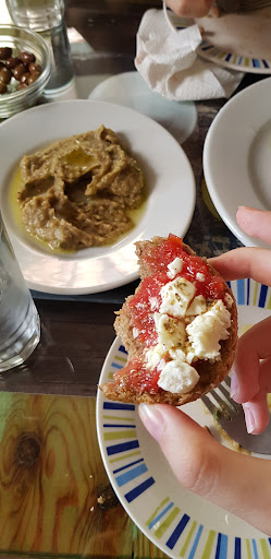 We decided to go eat a bit before getting to Cretaquarium from the bus stop, so we enter and we see a blackboard with some dishes in Greek, most of them ranging from 3 to 3.5 euro. She greets us and asks us what we would like to eat, we tell her something fast and cheap, no need for much. She serves us some olives, a bit of bread and water, and a bit of a Balkanic salad which is put on bread + 2 small crunchy breads with cheese and tomato on top.