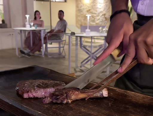 We arrived at 9 pm on a Saturday, greeted warmly by a waiter who wasted no time telling us — while still walking to the table — that the kitchen had only one Tomahawk Black Angus steak left. Funny coincidence that this “last steak on Earth” costs a casual €80. Spoiler: we fell for it.