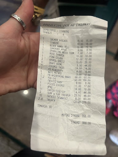 I wanted a steak and was told by the man who asks you to eat here outside it was very good steak. The menu showed a number of steaks at various prices. Went in sat down in a nice atmosphere great location. Got a drink waiter came to order asked for ribeye, was told they only had a 400g left. Was then told that price on menu is per 100g , perhaps I was a bit naive but it doesn’t say that anywhere, it was same for their fish. So the steak would cost me €56 , you then have to pay another €8 for frozen oven cooked wedges and then more for vegetables. In all about £70. Pricey for holiday restaurant. Had a bit of hump by now and should have left. Waiter suggested I had beef fillets so I said yes, wife ordered salmon on risotto which she said was very nice. Waited 40 minutes for food, no waiter approached us in this time I had to ask them for another drink. When my dish came up it was a pasta dish covered in nuts and an egg in the middle of it . Found the 4 pieces of beef at the bottom. Not what I was expecting. I questioned the top man in restaurant , English was a bit limited, not an issue as I don’t speak Greek, I was trying to say that I could have a nut/egg allergy but wasn’t asked when waiter suggested this dish . It was very tasty but I’m not keen on pasta. Didn’t want to be there any longer so asked for bill , nothing appeared so had to ask 10 minutes later. Felt like we was wasn’t welcome because I’d asked a few questions and didn’t buy an...